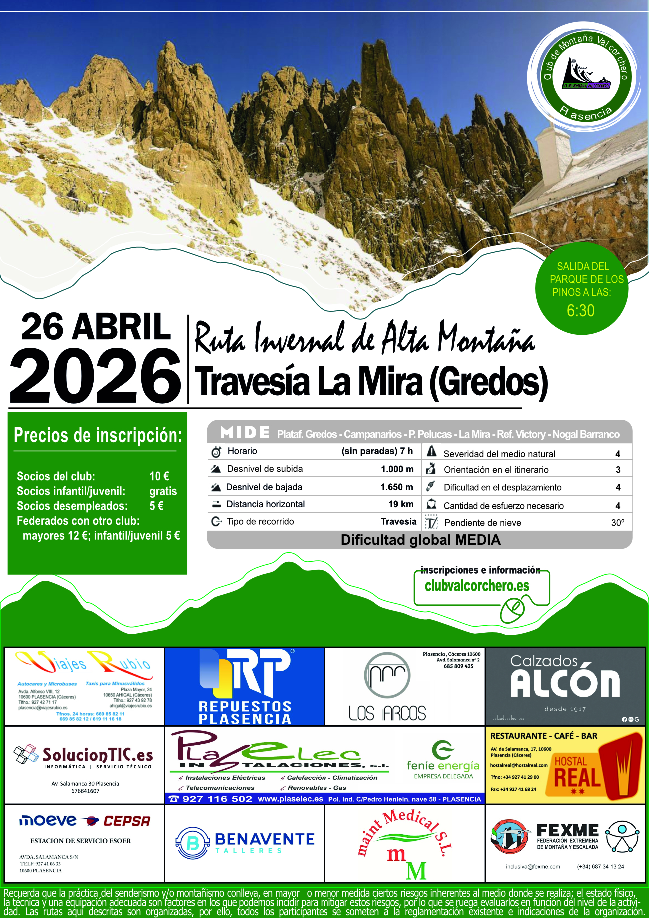 Información adicional: Ruta de ALTA MONTAÑA. No permitida a no Fed. La semana que viene confirmaremos si es necesario llevar crampones y piolet. |